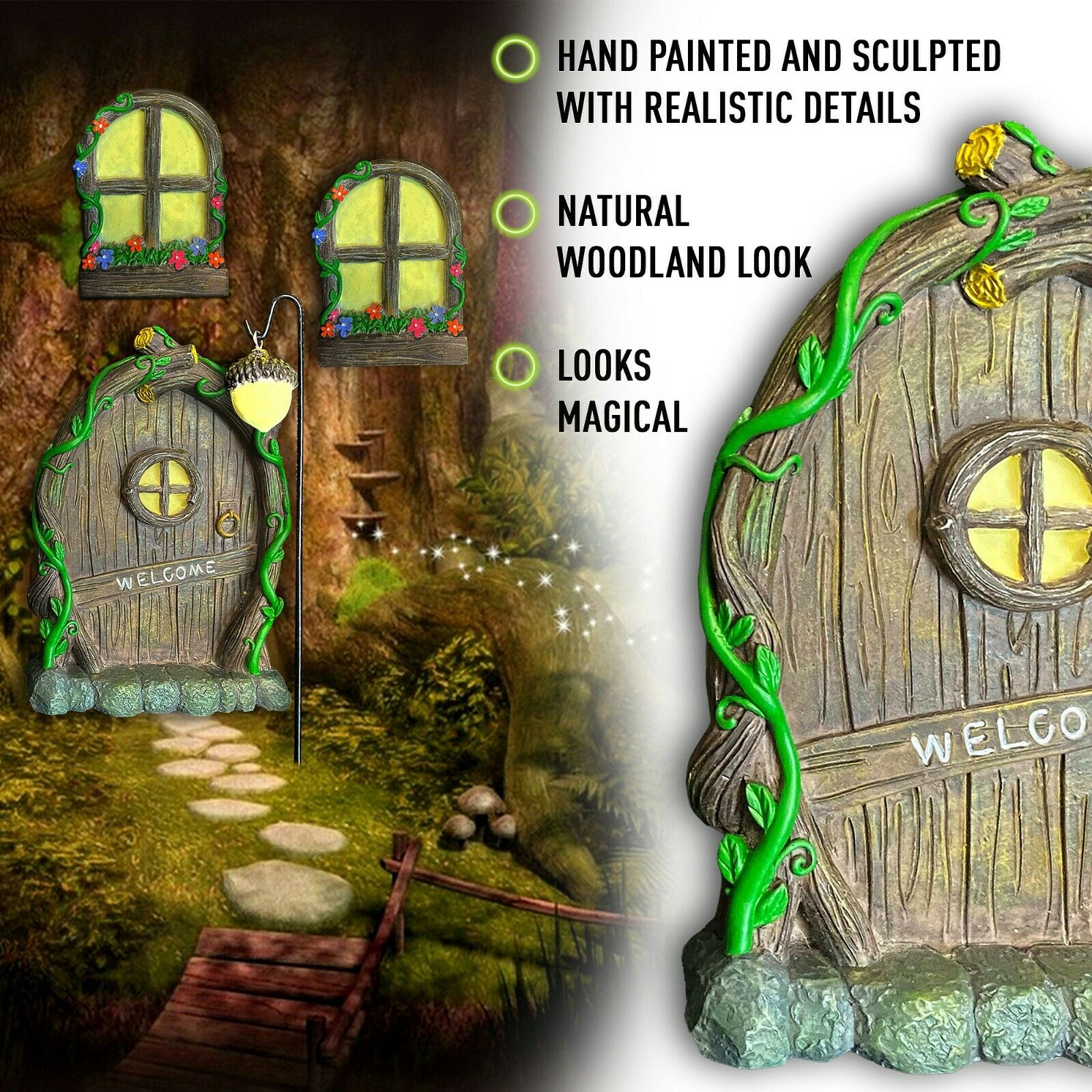 - Glows In The Dark - This outdoor fairy door is beautifully hand painted and sculpted with realistic details and a natural woodland look. It includes two glow in the dark windows which will collect sunlight during the day to give your garden a whimsical look at night. It looks absolutely magical nestled at the base of a tree or hidden in the bushes for the little ones to find.