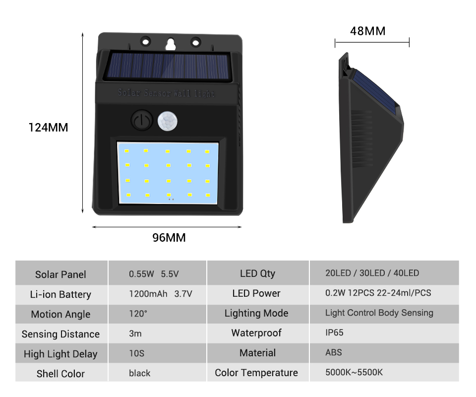 Specification: Type: Road Solar Collector Light Power: lithium battery / solar power Battery: 3.7v-1200mah Charging time: 8 hours Operating time: fully charged, 50 times induction per night, for 3 to 4 consecutive days. Number of LEDs: 20 -100 Sensing distance: 120 掺? 3-5m Waterproof rating: IP65 Material: ABS plastic Body color: black Package content: 1 black (including accessories)