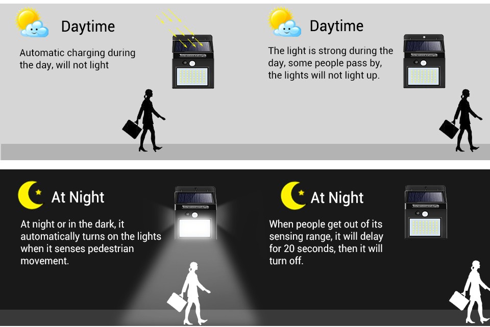 1. Automatic induction, in the In the dark or at night, when the movement detects people at 120 掺?and 3-5 meters, the sun sports light automatically turns on.