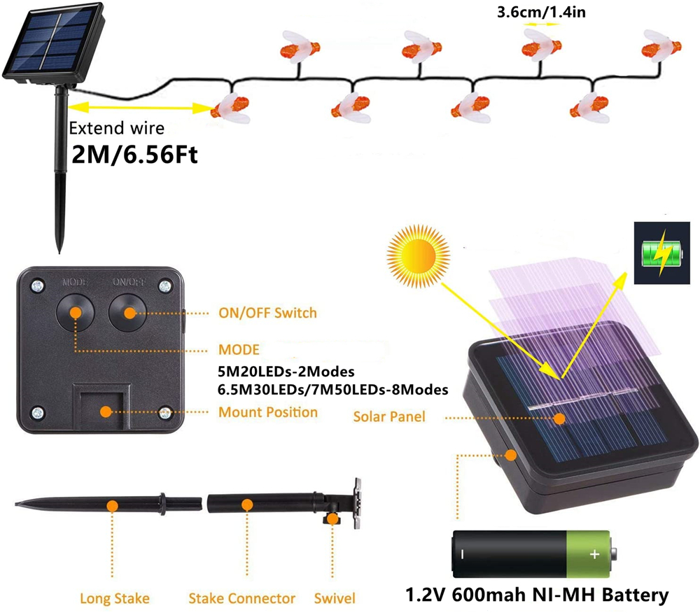 1. Light color: Warm White 2. Battery: built-in 600mAH NI-MH battery 3. Function閿?0LEDS(2Modes) 30/50 Leds(8Modes)閳剁嚈ombination 閳?In Wave 閳额敼equential 閳?Slow Glow 閳额棭hasing / Flash 閳额櫃low Fade 閳额毢winkle / Flash 閳?Steady On 4. Charging time: 6 hours 5. Working time: 8-10 hours 6. LED quantity: 20/30/50 Leds 7. Battery: 1.2V 600MA 8. Solar panel: 2V 100MA 9. Length of String: 5M/6.5M/7M 10. Length from Solar panel to first stake: 2M