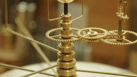 The mechanism is fully visible under the orbiting planet and is a fascinating display of moving solid brass gears.