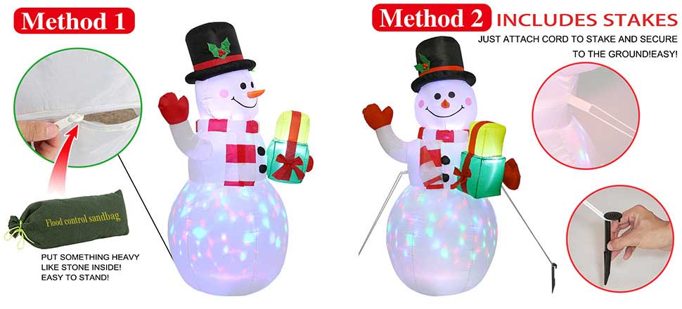 2. Cost-Effective: 5Ft Christmas inflatables Snowman decorations, large size, and built-in LED rotating lights. Putting it in your yard is easy to get eye-catching.