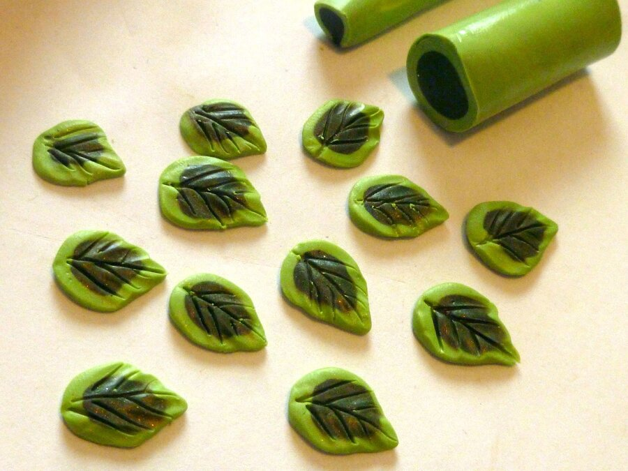 I know I want this dragon's body to be covered in leaf scales so I begin with the background, where I want his body to appear to be coming from. I make some polymer clay canes (a rod of polymer clay consisting of two or more colors that form an image). I cut pieces from the canes and form each piece into a leaf shape.