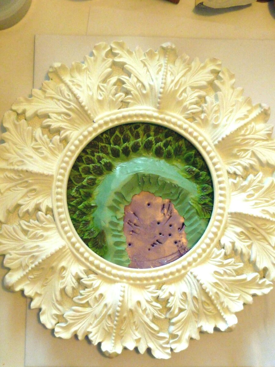 Next, I make a clay back on my frame and then start laying the leaves one at a time. This is a time-consuming process that will cover my entire sculpture.