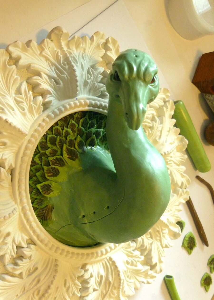 The dragon is attached to the frame back with craft wire and liquid Sculpey, useful material for any sculptor. It works like glue you can bake.